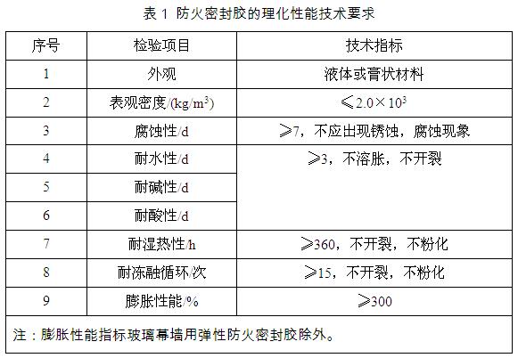 標準對防火密封膠在理化性能方面提出了要求,具體技術指標見表1。