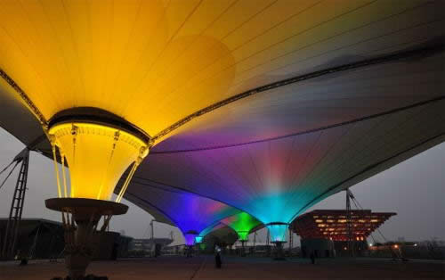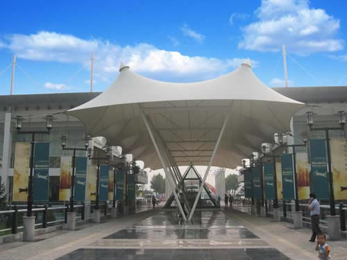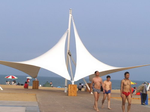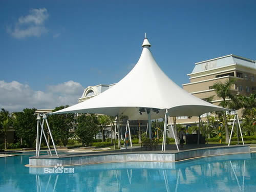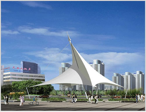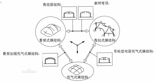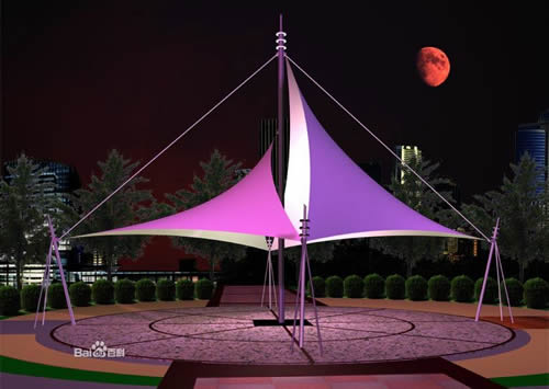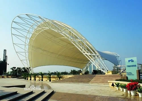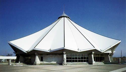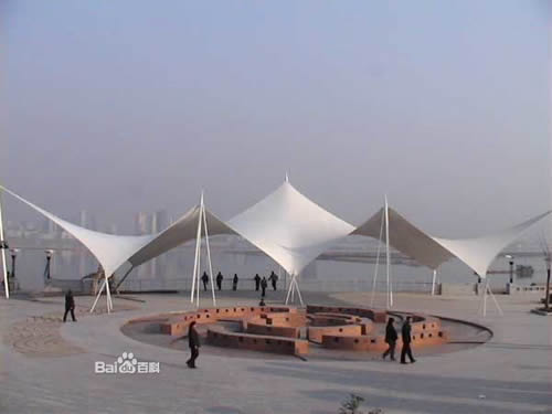 ![]() 索膜結構:是用高強度柔性薄膜材料經受其它材料的拉壓作用而形成的穩定曲面,能承受一定外荷載的空間結構形式。其造型自由、輕巧、柔美,充滿力量感,阻燃、制作簡易、安裝快捷、節能、易于、使用安全等優點,因而使它在世界各地受到廣泛應用。 索膜結構作為新的建筑形式于本世紀五十年代在國際上開始出現,至今已有六十多年的歷史,特別是到了七十年代以后,膜結構的應用得到了迅速發展。膜結構的出現為建筑師們提供了超出傳統建筑模式以外的新選擇。膜結構一改傳統建筑材料而使用膜材,其重量只是傳統建筑的三十分之一。而且膜結構可以從根本上克服傳統結構在大跨度(無支撐)建筑上實現時所遇到的困難,可創造巨大的無遮擋的可視空間。其造型自由輕巧、阻燃、制作簡易、安裝快捷、節能、易于、使用安全等優點,因而使它在世界各地受到廣泛應用。另外值得一提的是,在陽光的照射下,由膜覆蓋的建筑物內部充滿自然漫射光,無強反差的著光面與陰影的區分,室內的空間視覺環境開闊和諧。夜晚,建筑物內的燈光透過屋蓋的膜照亮夜空,建筑物的體型顯現出夢幻般的效果。這種結構形式特別適用于大型體育場館、入口廊道、小品、公眾休閑娛樂廣場、展覽會場、購物中心等領域。 ![]() 張拉膜結構 ![]() ![]() 張拉膜結構(Tesioned Membrane Structure) ,是依靠膜自身的張拉應力與支撐桿和拉索共同構成機構體系。在陽光的照射下,由膜覆蓋的建筑物內部充滿自然漫射光,無強反差的著光面與陰影的區分,室內的空間視覺環境開闊和諧。夜晚,建筑物內的燈光透過屋蓋的膜照亮夜空,建筑物的體型顯現出夢幻般的效果。張拉膜結構特別適合用來建造城市標志性建筑的屋頂,如體育與娛樂性場館,需有廣告效應的商場、餐廳等。城市的交通樞紐是城市命脈的關鍵性建筑,使用功能要求建筑物各組成單元的標志明確。因而近來年,這類建筑越來越多采用膜結構。建筑膜材料的使用壽命為 25 年以上。在使用期間,在雪或風荷載作用下均能保持材料的力學形態穩定不變。建成于 1973 年的美國加州La Verne 大學的學生活動中心是已有 23 年歷史的張拉膜結構建筑.跟蹤測試與材料的加載與加速氣候變化的試驗,證明它的膜材料的力學性能與化學穩定性指標下降了 20 %至 30 %,但仍可正常使用。膜的表層光滑,具有彈性,大氣中的灰塵、化學物質的微粒極難附著與滲透,經雨水的沖刷建筑膜可恢復其原有的清潔面層與透光性。 PTFE建筑膜材 ![]() PTFE膜材是在超細玻璃纖維織物上涂以聚四氟乙烯樹脂而成的材料。這種膜材有較好的焊接性能,有優良的抗紫外線、抗老化性能和阻燃性能。另外,其防污自潔性是所有建筑膜材中最好的,但柔韌性差,施工較困難,成本也十分驚人。在蓋格公司領導下,美國的杜邦公司、康寧玻纖公司、貝爾德建筑公司、化纖織布公司共同開發永久性膜材。其加工方法是把玻纖織物多次快速放入特氟隆熔體中,使織物兩面皆有均勻的特氟隆涂層,使永久性的PTFE膜正式誕生。此后永久性膜結構正式在美國風行,許多學者對膜結構進行了深入的研究。20年后跟蹤檢測結果表明,這種膜材的力學性能與化學穩定性指標只下降了20%~30%,顏色也幾乎沒變,膜的表層光滑,具有彈性,大氣中的灰塵、化學物質微粒極難附著與滲透,經雨水沖刷建筑膜可恢復其原有的清潔面層與透光性,這足以顯示出PTFE膜材的強大生命力和廣闊的市場前景。 玻纖PVC建筑膜材 這種膜材開發和應用得比較早,通常規定PVC涂層在玻璃纖維織物經緯線交點上的厚度不能少于0.2mm,一般涂層不會太厚,達到使用要求即可。為提高PVC本身耐老化性能,涂層時常常加入一些光、熱穩定劑,淺色透明產品宜加一定量的紫外吸收劑,深色產品常加炭黑做穩定劑。另外對PVC的表面處理還有很多方法,可在PVC上層壓一層極薄的金屬薄膜或噴射鋁霧,用云母或石英來防止表面發粘和沾污。玻纖有機硅樹脂建筑膜材。有機硅樹脂具有優異的耐高低溫、拒水、抗氧化等特點,該膜材具有高的抗拉強度和彈性模量,另外還具有良好的透光性。美國歐文斯克寧公司開發的Vestar膜材就采用這種樹脂對玻璃纖維布涂覆而制成的,目前這種膜材應用的不多,生產廠家也較少。玻纖合成橡膠建筑膜材。合成橡膠(如丁腈橡膠,氯丁橡膠)韌性好,對陽光、臭氧、熱老化穩定,具有突出的耐磨損性、耐化學性和阻燃性,可達到半透明狀態,但由于容易發黃,故一般用于深色涂層。膨化PTFE建筑膜材。由膨化PTFE纖維織成的基布兩面貼上氟樹脂薄膜即得膨化PTFE建筑膜材。由于它的造價太高,一般的建筑考慮到成本和性能兩方面,很少選用這種膜材,目前國外的生產廠家也不多。 ETFE建筑膜材 由ETFE(乙烯-四氟乙烯共聚物)生料直接制成。ETFE不僅具有優良的抗沖擊性能、電性能、熱穩定性和耐化學腐蝕性,而且機械強度高,加工性能好。近年來,ETFE膜材的應用在很多方面可以取代其他產品而表現出強大的優勢和市場前景。這種膜材透光性特別好,號稱“軟玻璃”,質量輕,只有同等大小玻璃的1%;韌性好、抗拉強度高、不易被撕裂,延展性大于400%;耐候性和耐化學腐蝕性強,熔融溫度高達200℃;可有效的利用自然光,節約能源;良好的聲學性能。自清潔功能使表面不易沾污,且雨水沖刷即可帶走沾污的少量污物,清潔周期大約為5年。另外,ETFE膜