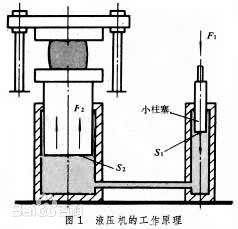 3簡史 1795年,英國的J.布拉默應(yīng)用帕斯卡原理發(fā)明了水壓機(jī),用于打包、榨植物油等。到19世紀(jì)中期,英國開始把水壓機(jī)用于鍛造,水壓機(jī)遂逐漸取代了超大型蒸汽鍛錘。到19世紀(jì)末,美國制成126000千牛自由鍛造水壓機(jī)。此后,全世界先后制造20余臺10萬千牛級的自由鍛造水壓機(jī),其中中國制造的有2臺(見彩圖)。隨著電動高壓泵的出現(xiàn)和完善,鍛造水壓機(jī)也向較小噸位方向發(fā)展。20世紀(jì)50年代后出現(xiàn)了小型快速鍛造水壓機(jī),可進(jìn)行相當(dāng)于30~50千牛鍛錘所做的工作。40年代,德國制成180000千牛的巨型模鍛水壓機(jī),此后全世界先后制成180000千牛以上的模鍛水壓機(jī)18臺,其中中國制造的一臺為300000千牛。 4工作原理 液壓機(jī)的工作原理。大、小柱塞的面積分別為S2、S1,柱塞上的作 用力分別為F2、F1。根據(jù)帕斯卡原理,密閉液體壓強(qiáng)各處相等,即F2/S2=F1/S1=p;F2=F1(S2/S1)。表示液壓的增益作用,與機(jī)械增益一樣,力增大了,但功不增益,因此大柱塞的運(yùn)動距離是小柱塞運(yùn)動距離的S1/S2倍。