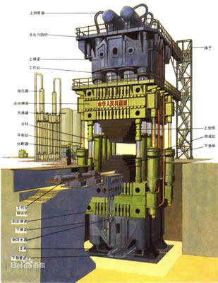 2用途 液壓機(jī)是一種以液體為工作介質(zhì),用來傳遞能量以實現(xiàn)各種工藝的機(jī)器。液壓機(jī)除用于鍛壓成形外,也 可用于矯正、壓裝、打包、壓塊和壓板等。液壓機(jī)包括水壓機(jī)和油壓機(jī)。以水基液體為工作介質(zhì)的稱為水壓機(jī),以油為工作介質(zhì)的稱為油壓機(jī)。液壓機(jī)的規(guī)格一般用公稱工作力(千牛)或公稱噸位(噸)表示。鍛造用液壓機(jī)多是水壓機(jī),噸位較高。為減小設(shè)備尺寸,大型鍛造水壓機(jī)常用較高壓強(qiáng)(35兆帕左右),有時也采用 100兆帕以上的超高壓。其他用途的液壓機(jī)一般采用 6~25兆帕的工作壓強(qiáng)。油壓機(jī)的噸位比水壓機(jī)低。